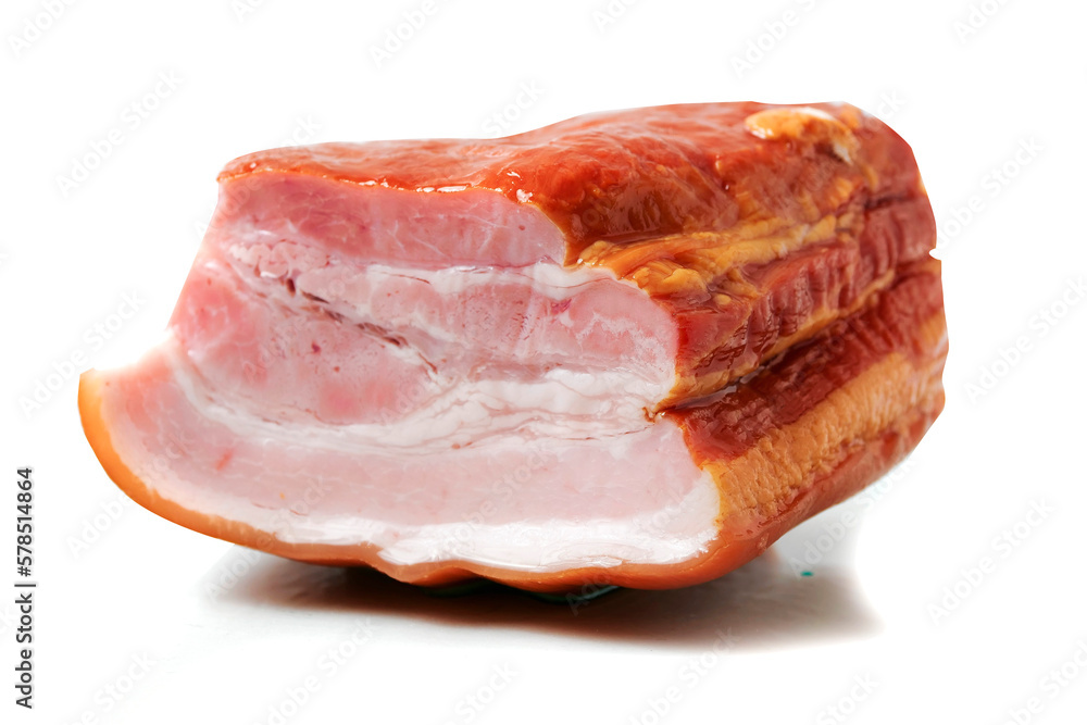 Traditional smoked pork ham on white background. Classic meat product ready to eat with layers of meat and fat and delicate flavor. Polish and East European popular meal.