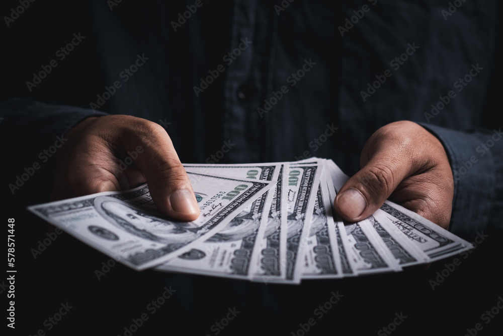 Businessman hand holding money. Saving money, income, earning and investment concept. Dark tone. Money Problem.