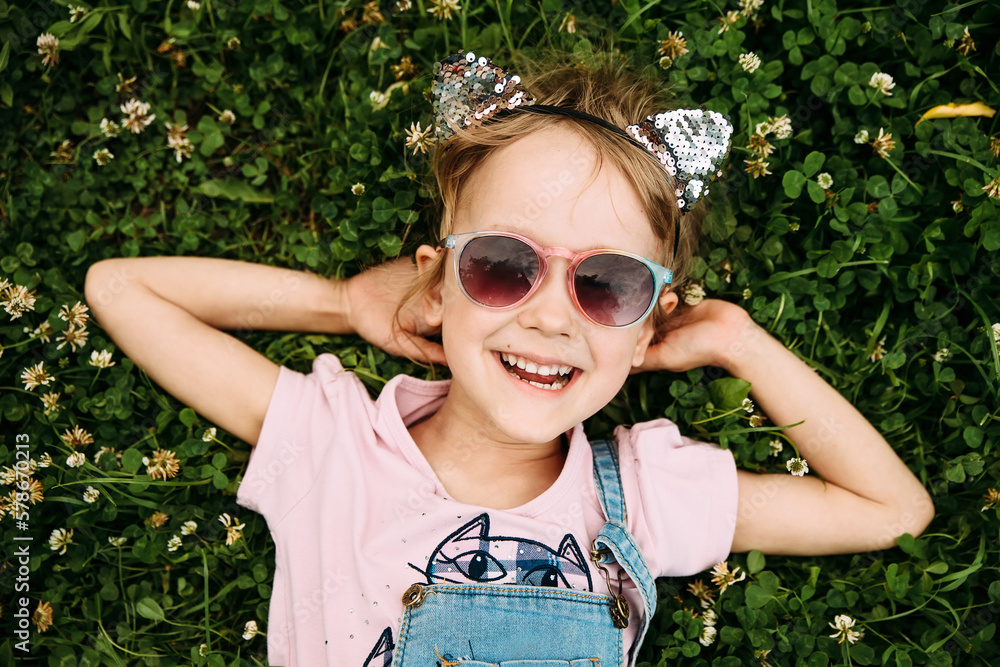 Portrait of a little girl wearing a cat ear headband lies on the grass
