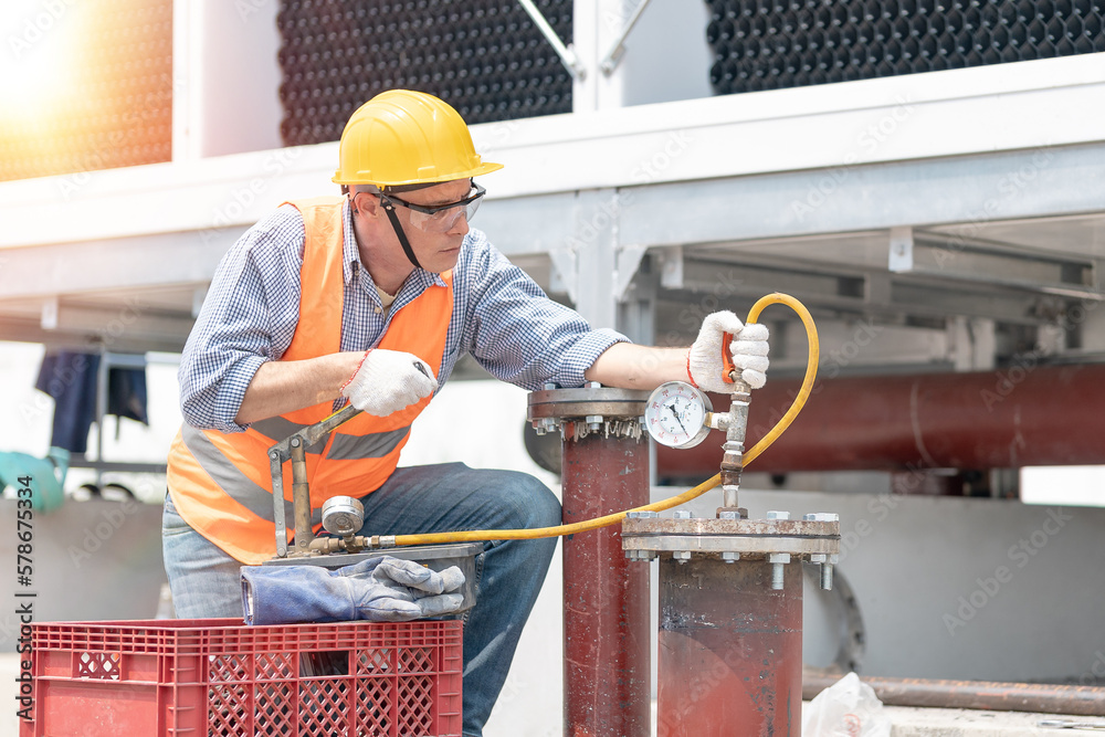 Mechanical maintenance technician inspecting pressure gauge of heating system in heating plant.