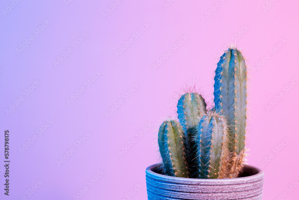 Neon Cactus. Green cactus in gray pot on pink background. Minimal creative stillife. Copy space