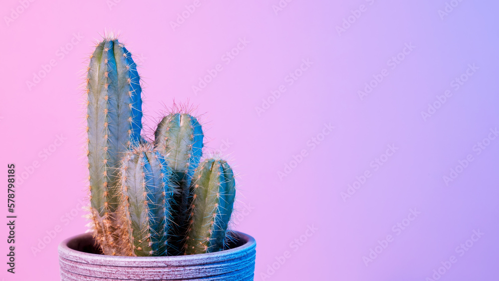 Neon Cactus. Green cactus in gray pot on pink background. Minimal creative stillife. Copy space