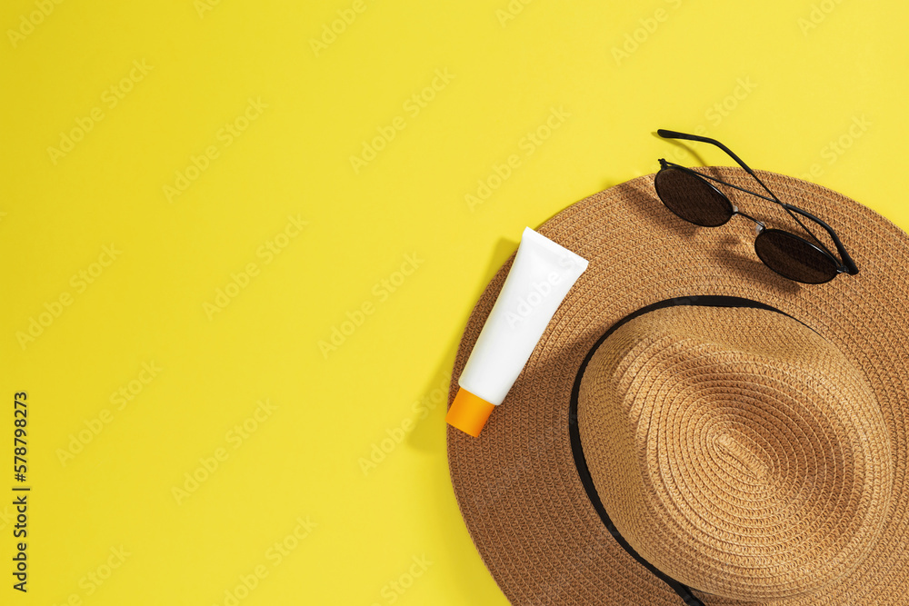Things for beach sunscreens, hat and sunglasses. Safe exposure to sun. Skin Cancer Awareness Month Concept. Top view. Copy space