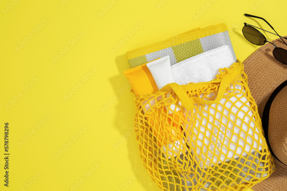String bag with things for beach towel, sunscreens, hat and sunglasses. Safe exposure to sun. Skin Cancer Awareness Month Concept. Top view. Copy space