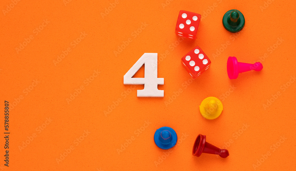 Number 4 with dice and board game pieces - Orange eva rubber background