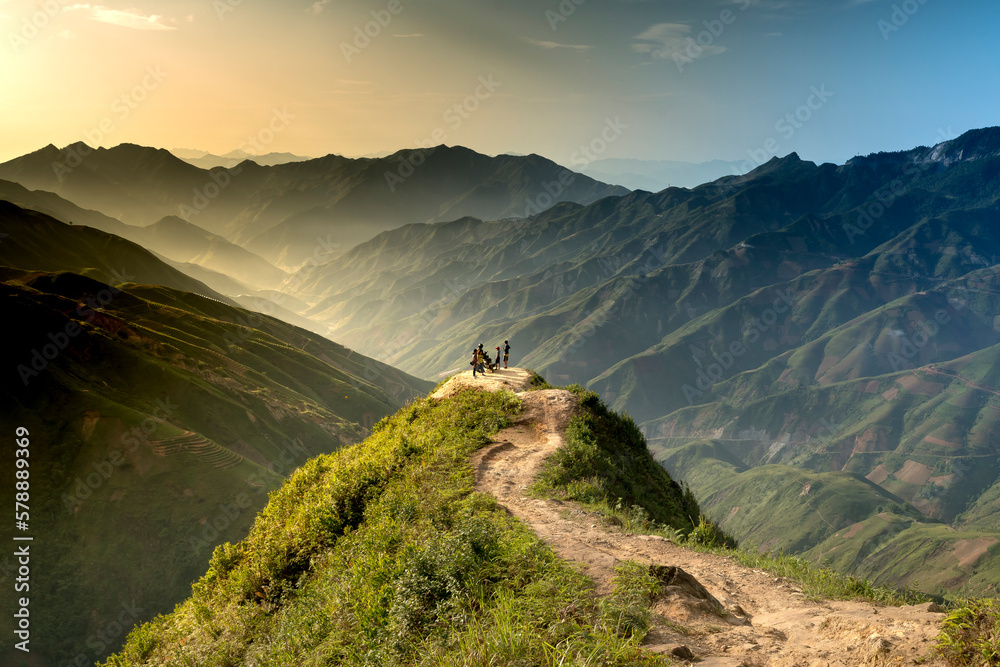 Hiking tourists explore the trail on spine and the top of the mountains Ta Xua. This is a very popular tourist destination in VN