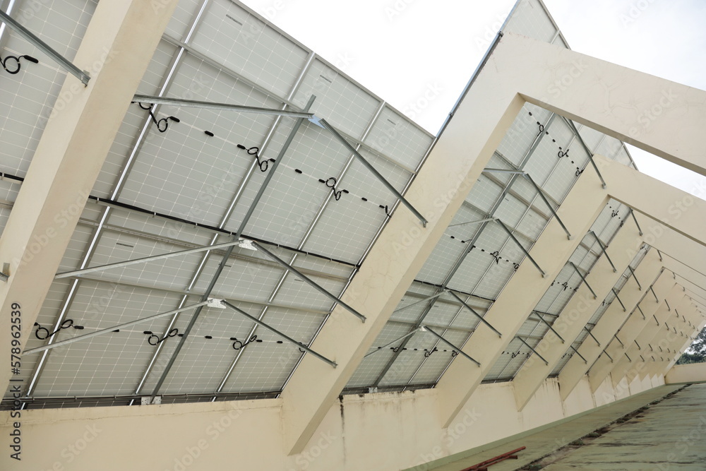 Solar panels with a roof frame. Behind photovoltaic or alternative energy cells installed on cement gables on building roofs with copy space and selective focus.
