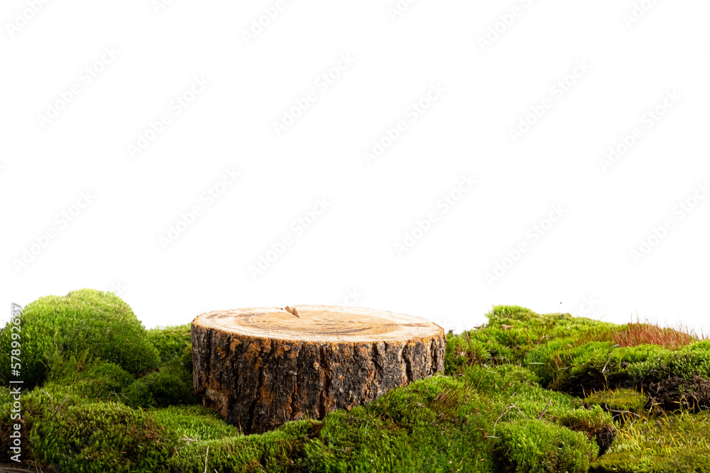 natural style. Wooden saw cut, round podium with green moss on a transparent background. Still life for the presentation of products.