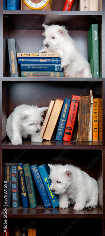 West Highland White Terrier puppy at home. Cute puppy. Kennel. Dog litter