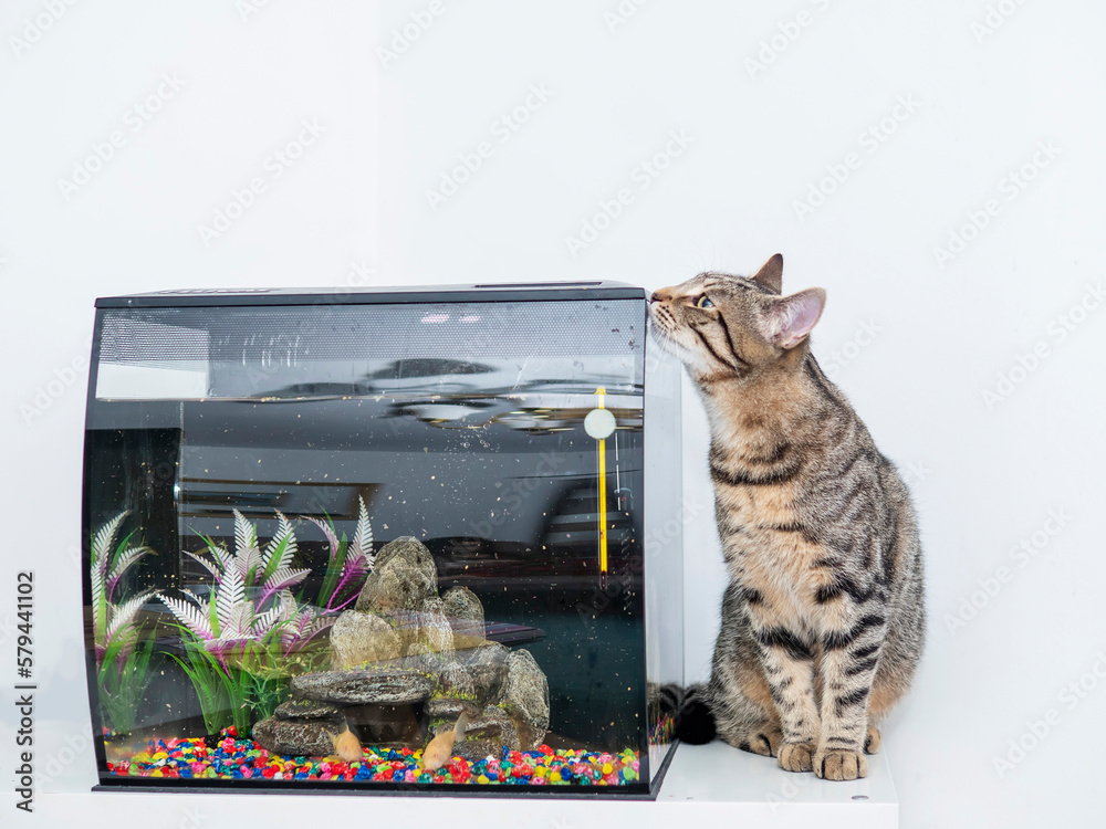 Cute tabby cat and a small fish tank. Animal natural instinct for fishing and hunting. Light wall background.