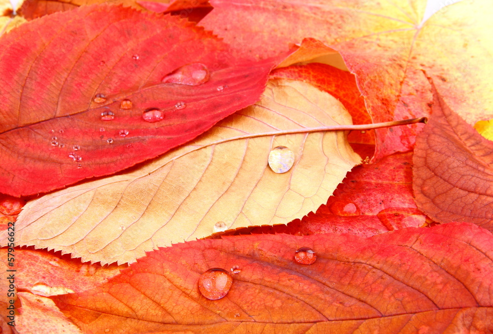 Red and yellow tree leaves with water drops