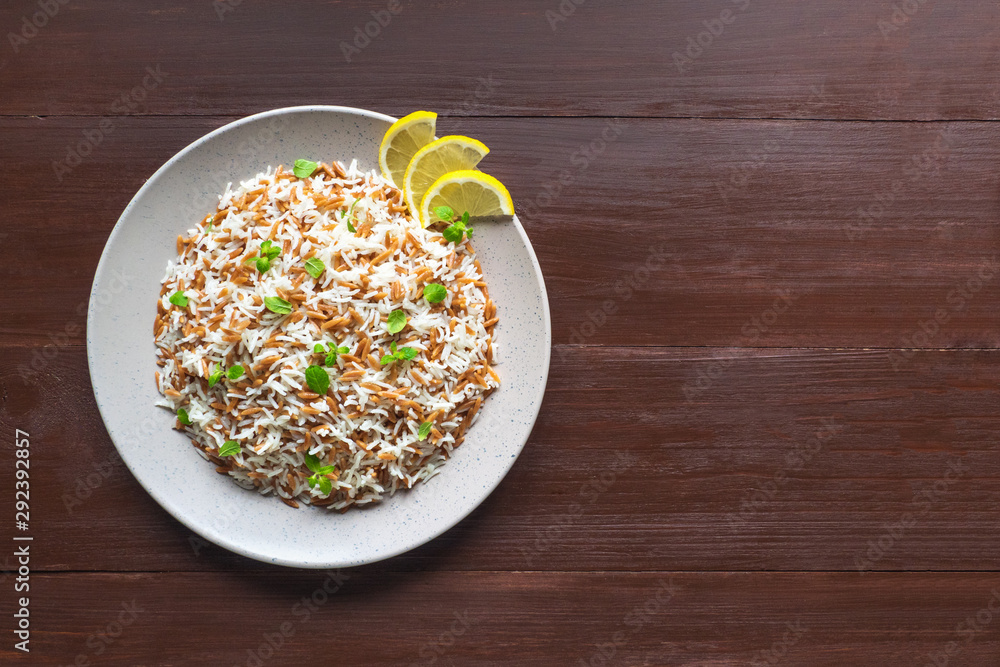 Three painted easter eggs celebrating a Happy Easter on a spring day with a green grass meadow, bright sunlight, tree leaves and a background with copy space and a wooden bench to display products.
