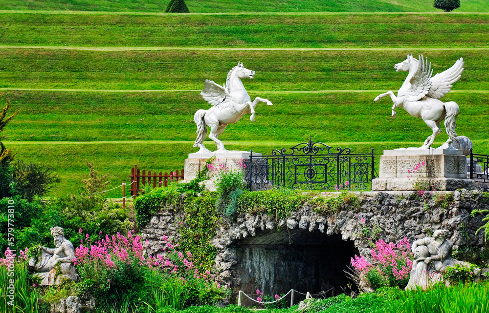 Powerscourt mansion house garden near Enniskerry, Ireland. Winged Pegasus horses horse statues cast in 1869 in zinc by Professor Hugo Hagen in Berlin