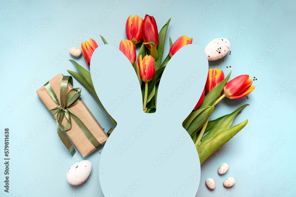 creative easter floral layout with bunny shape and tulips on pastel blue background. copy space. top view. flat lay