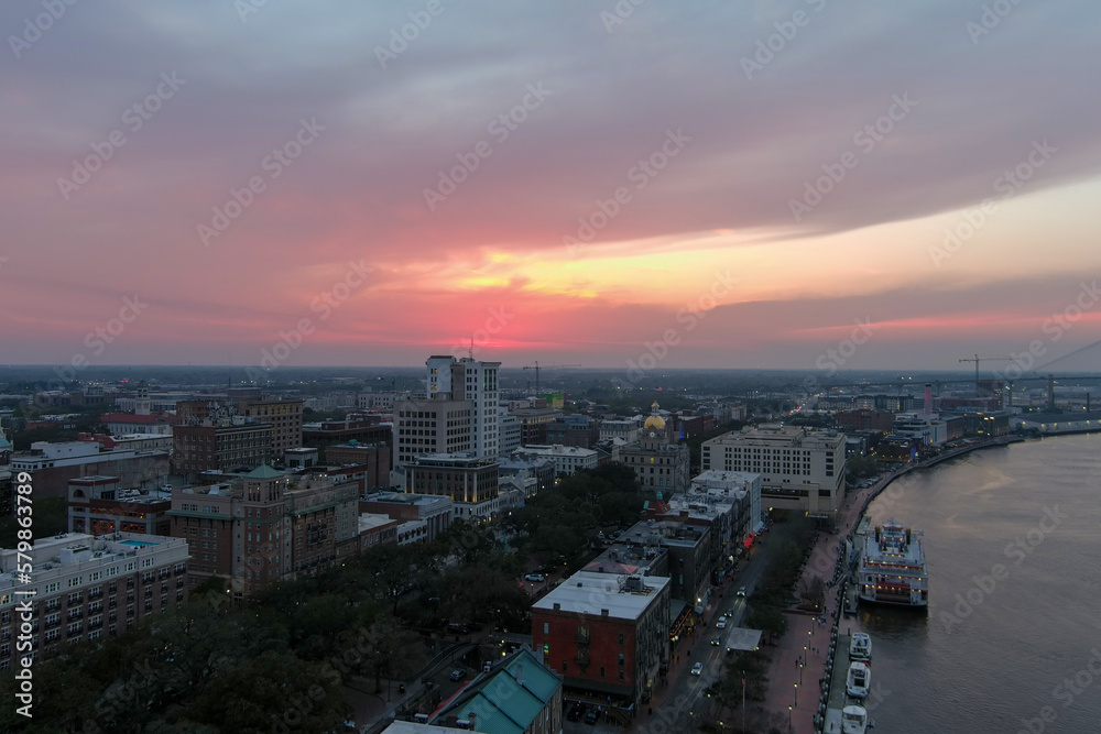 aerial shot of riverwalk along the Savannah River at sunset with hotels, restaurants, shops, Savannah City Hall and the Talmadge Memorial Bridge with boats along the banks in Savannah Georgia USA