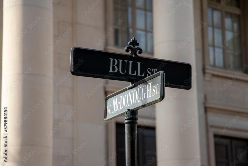 Black and white street signs on the corner of Bull Street and McDonough Street in Savannah Georgia USA