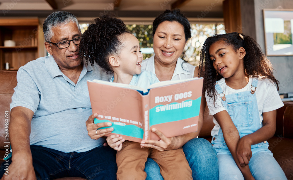 Children book, reading smile and grandparent helping kids with learning and story. House, living room and black family on a lounge couch with happiness and books together with love and support