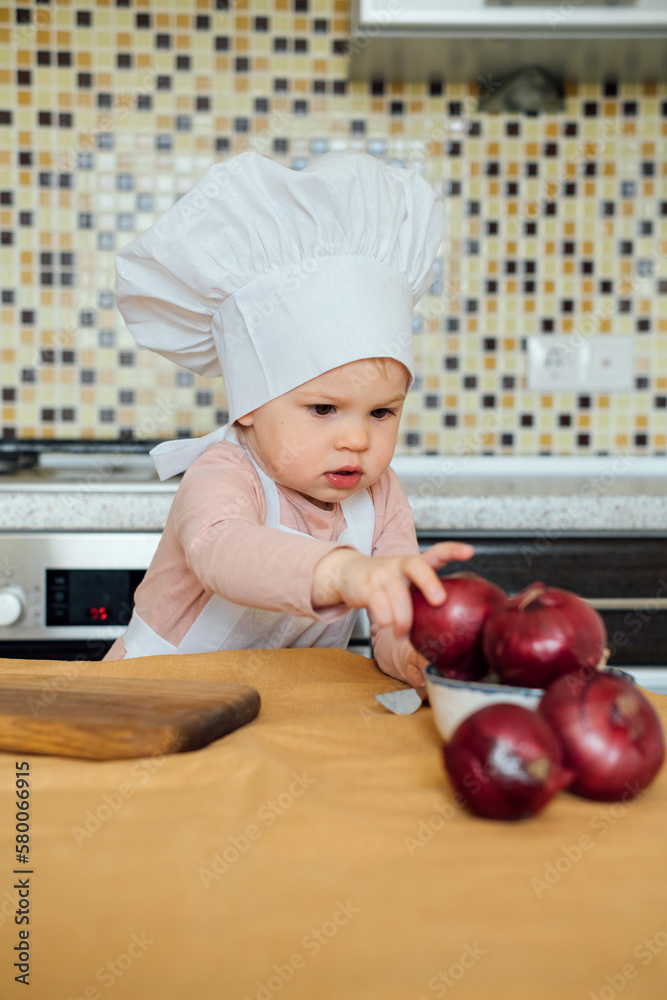 Little girl cooking in the kitchen wearing an apron and a Chef's hat