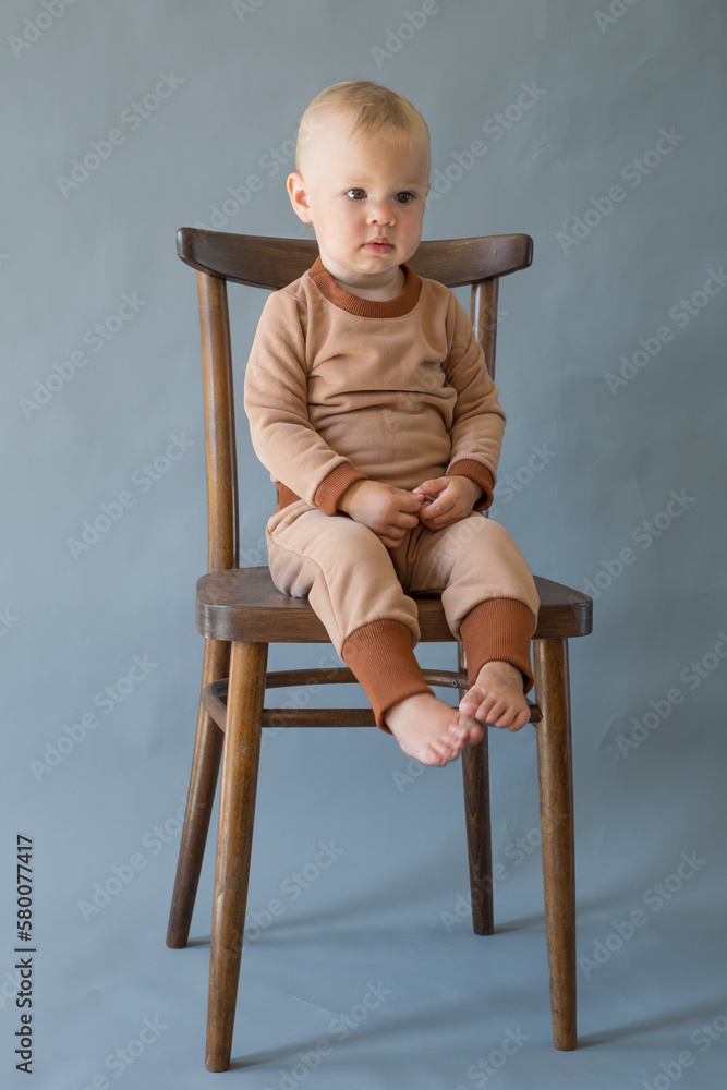 Portrait cute one year old baby girl, sitting on a wooden chair