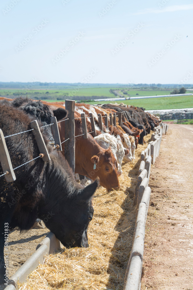 feedlot with Hereford and Angus cattle eating alfalfa