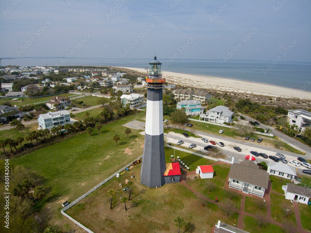 aerial shot of the a gorgeous spring landscape at Tybee Island Beach with the lighthouse, blue ocean water, a brown sandy beach, homes and lush green trees and grass in Tybee Island Georgia USA