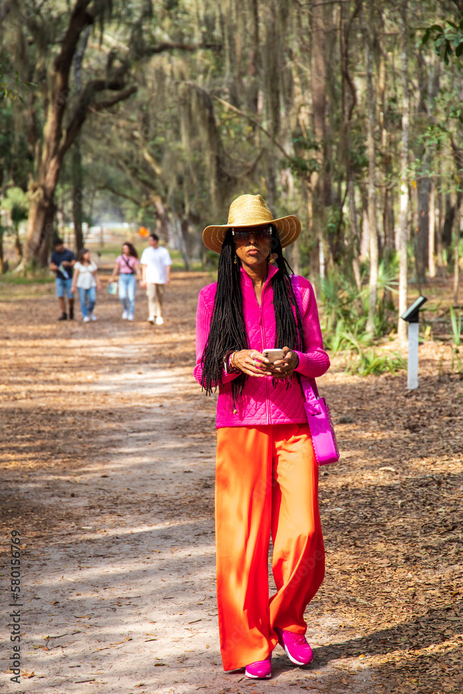An African American woman with long sisterlocks wearing a brown hat and pink jacket walking along a dirt trail with lush green weeping willow trees and plants at Wormsloe Historic Site in Savannah