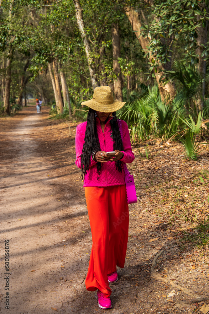 An African American woman with long sisterlocks wearing a brown hat and pink jacket walking along a dirt trail with lush green weeping willow trees and plants at Wormsloe Historic Site in Savannah