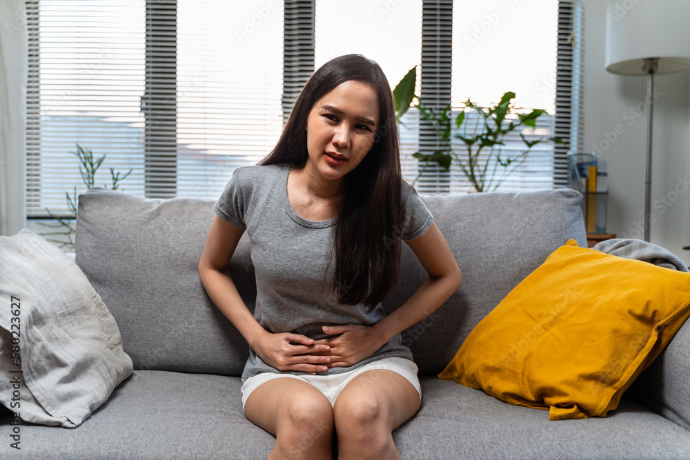 Asian women are having abdominal pain. She touched her stomach while experiencing pain caused by enteritis. Indigestion or menstruation on the sofa in the living room in healthy care concept.