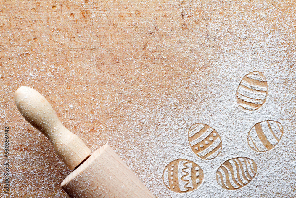 Easter eggs made of flour on chopping board with wooden rolling pin, easter baking background concept