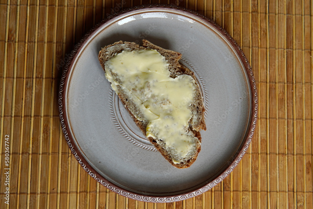 Scheibe Bauernbrot mit Butter bestrichen auf grauem Keramikteller