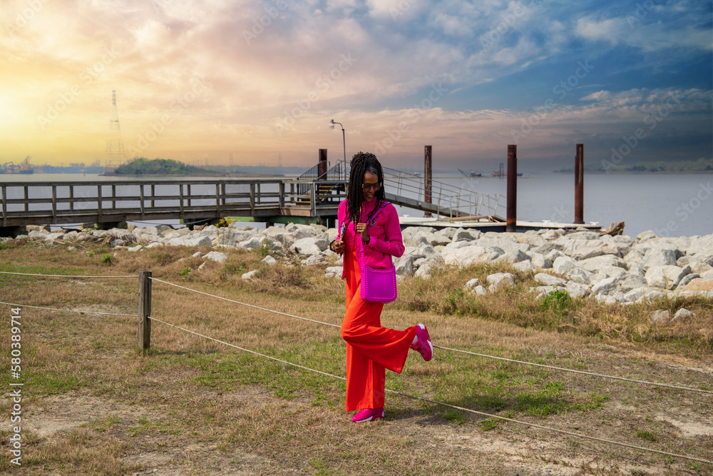 An African American woman with long sisterlocks wearing sunglasses and pink jacket standing in front of the Savannah River surrounded by rocks at Old Fort Jackson in Savannah Georgia USA