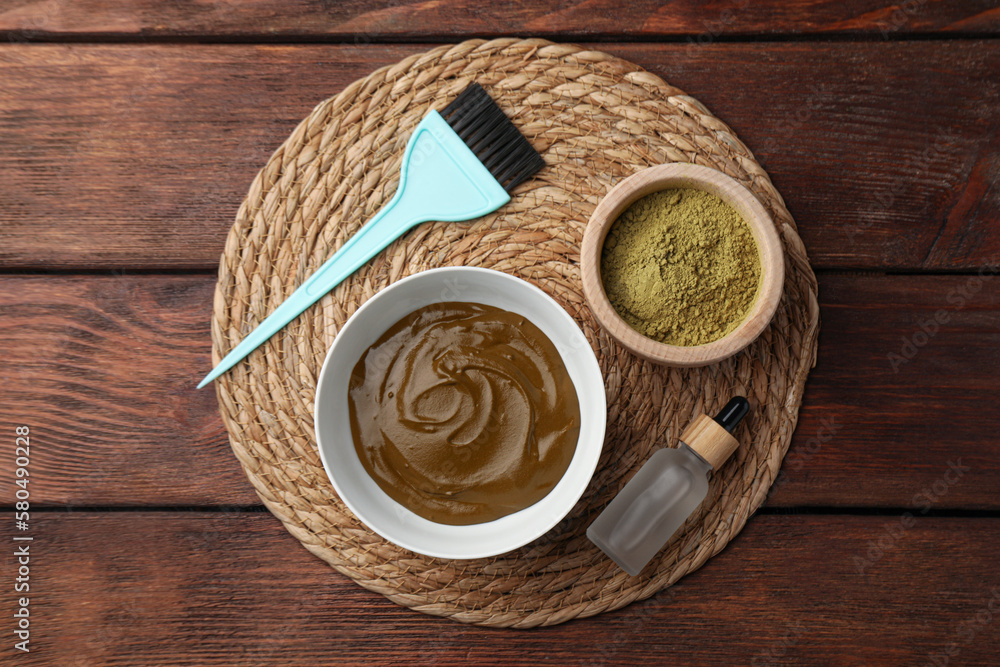 Composition with henna powder and cream on wooden table, top view. Natural hair coloring
