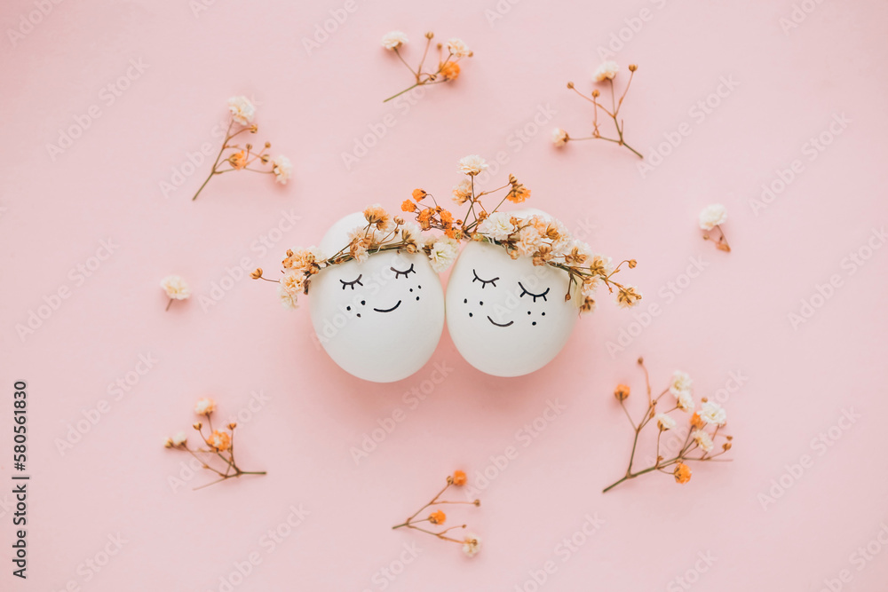Perfect colorful handmade easter eggs on pink background. The minimal concept. Top view. Card with a copy of the place for the text