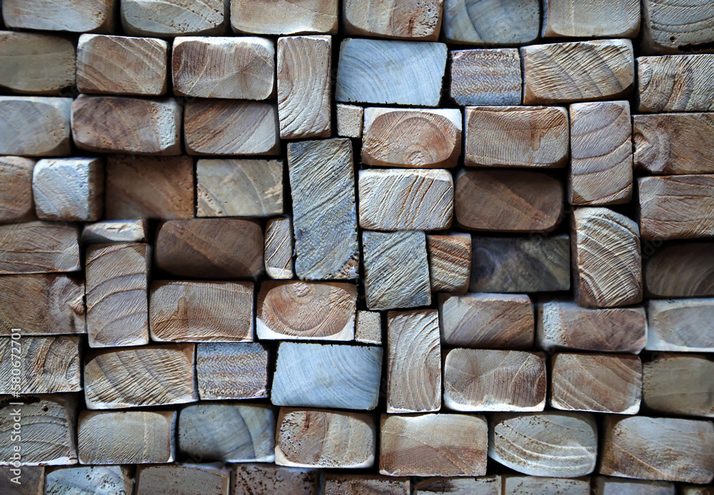 Eine Textur von Holz. Viele gestapelte Holzleisten von der Stirnseite.