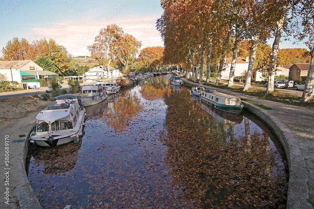 Bateaux sur le Canal du Midi vers Béziers, Platanes et berges, couleurs automnales, allées d'arbres , Occitanie, Languedoc Roussillon, sud de la France