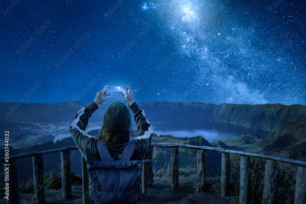 Woman with a smartphone under a starry night sky