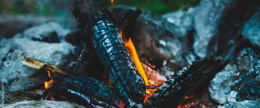 Vivid smoldered firewoods burned in fire close-up. Atmospheric warm background with orange flame of campfire. Unimaginable full frame image of bonfire. Burning logs in beautiful fire. Wonderful flame.