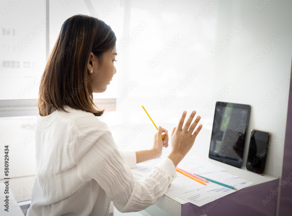 Beautiful asian online seller is using her tablet to record product reviews while sitting in her office.