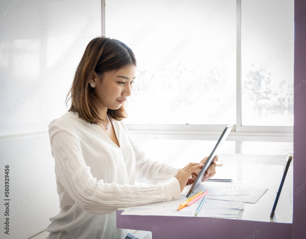 Beautiful asian businesswoman checking work on her tablet in her office room.