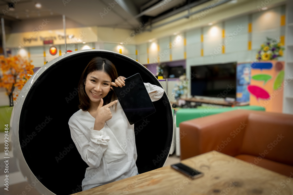 Beautiful office girl is showing off the performance of her tablet with a smile.