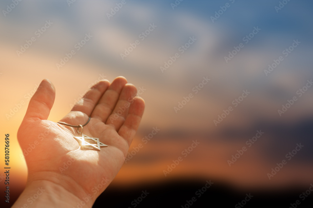 Closeup of pendant in the shape of the star of david on the hand of a man on sunset sky background. Holocaust remembrance day.