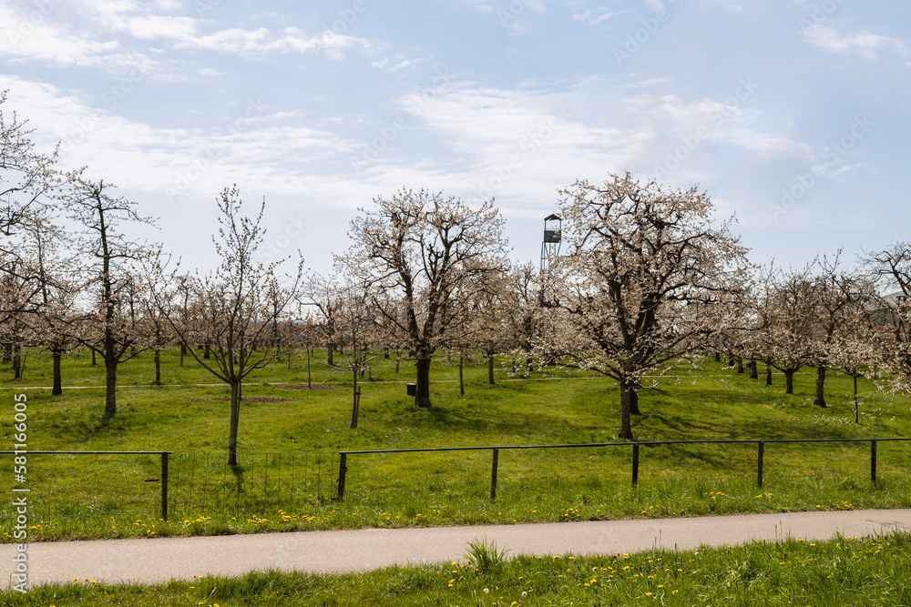Cherry orchard in bloom near the Dutch rural village of Cothen.