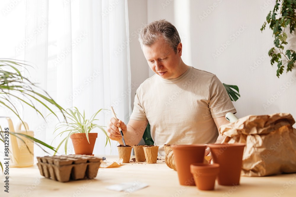 The process of planting tomato seeds in peat environmental cups. The gardener man pours the ground. Home gardening and growing vegetables.