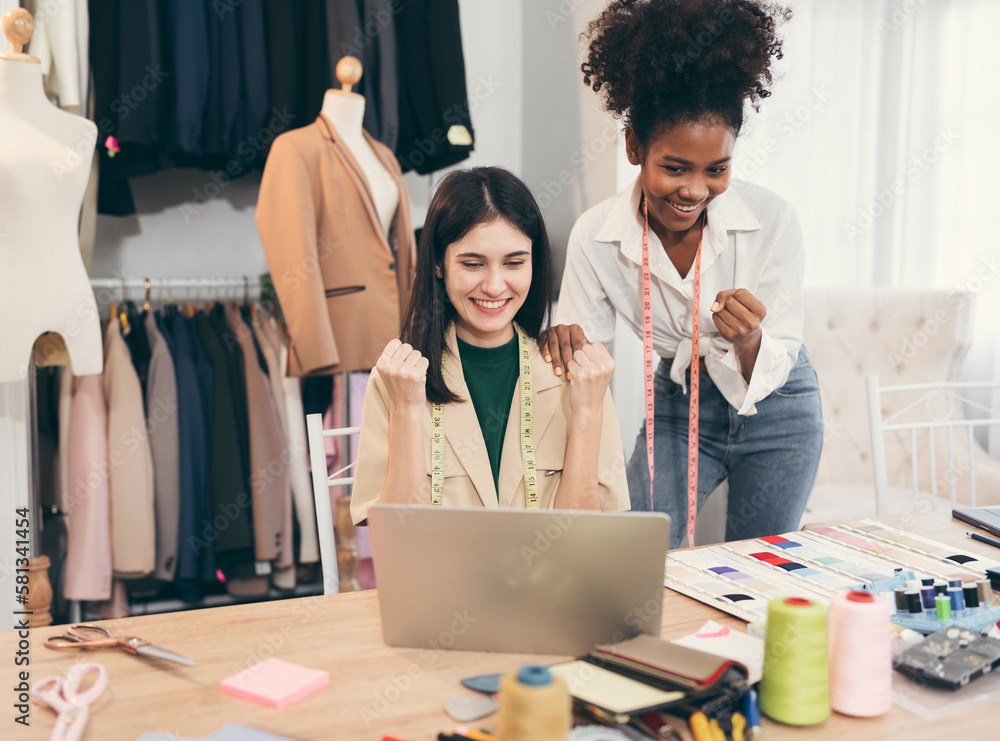 Happy beautiful Asia and African American woman fashion designer clothes working with sewing in own dressmaking studio or boutique