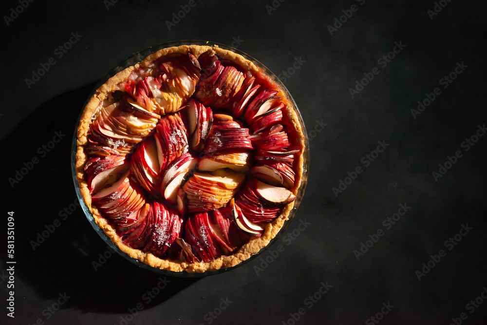 An open apple pie on a dark background in the rays of the bright sun close-up. bright contrast advertising, copy space. the concept of holidays, prosperity and generosity. fragrant pastries