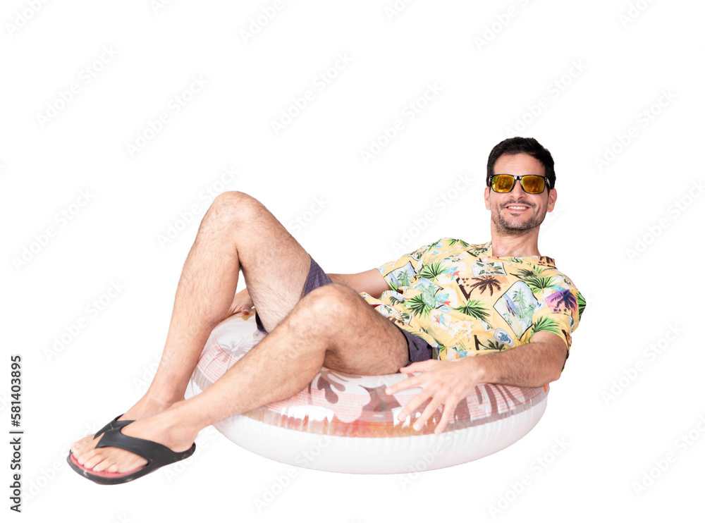 Portrait of a young smiling tourist in a beach shirt and sunglasses sitting on the inflatable float.