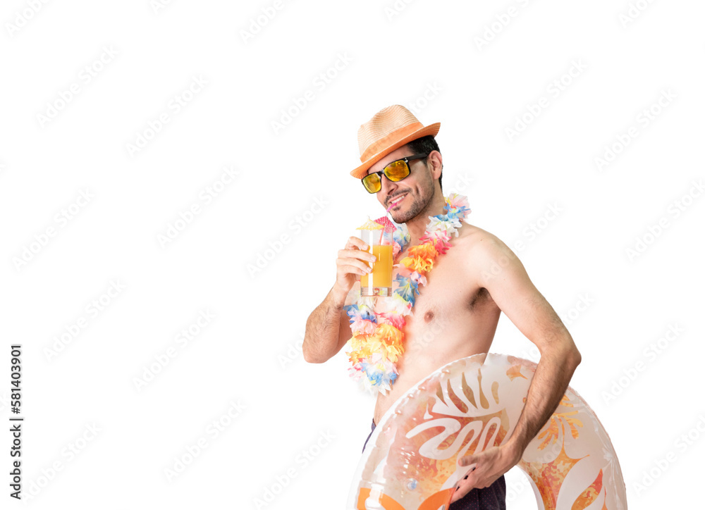 a smiling young tourist with a flower necklace, sunglasses and hat holds the inflatable float and takes his summer cocktail.