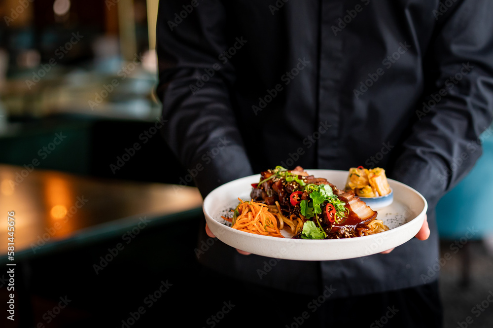 chef hand hold plate whith Stewed pork slice with noodles and vegetables