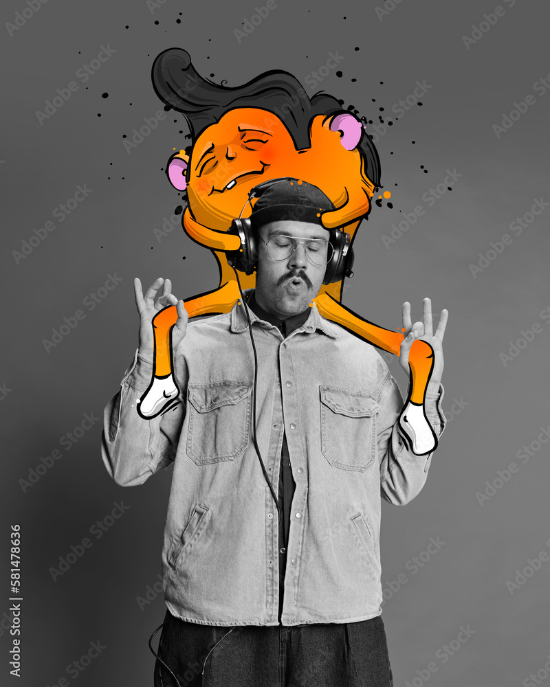 Contemporary art collage. Black and white image of stylish man listening to music with colorful cartoon style character on shoulders. Concept of surrealism, inner world, imagination and creativity