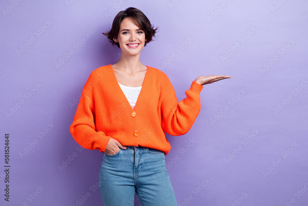 Portrait of nice positive girl toothy smile arm palm hold demonstrate empty space isolated on purple color background